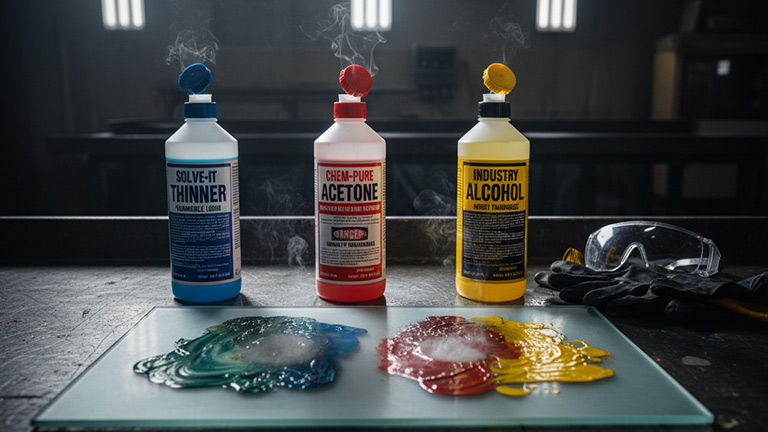 اگر لکههای رنگ شما قدیمی، ضخیم و سرسخت هستند و روشهای خانگی روی آنها کارایی ندارند، باید به سراغ حلالهای شیمیایی قویتر بروید. استفاده از این مواد نیازمند دقت و رعایت کامل نکات ایمنی است.